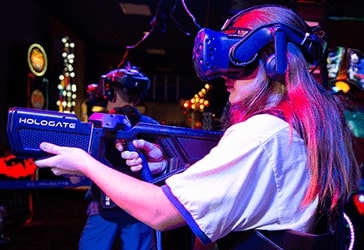 Just put on the HOLOGATE headsets and all of you will be transported into our immersive world of Virtual Reality where you’ll fight robots, zombies and dragons. Our exclusive multiplayer games are easy to learn and hard to master. Play together as a team or challenge your friends to a player vs. player competitive match.